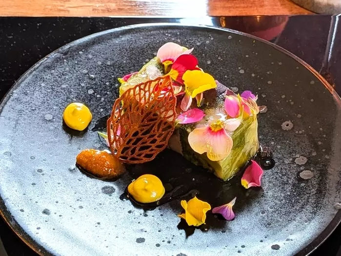 華やかでパッと目をひく、ある日の『~Entrée froide~小山農園 旬野菜とエディブルフラワーのテリーヌ』。契約農家直送の季節野菜と何種ものカラフルなエディブルフラワーが一皿にぎゅっと凝縮し、四季の彩りと香り、旬の滋味が丁寧に表現されたコース限定で楽しむことができる【Freeeat】のスペシャリテです