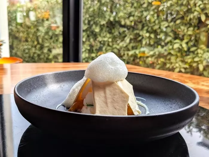 金柑のコンポートをメレンゲで包んだ、この日のデザート。ちなみに上にのっているきめ細かな“泡”も、金柑をコンポートした際のものを使用しているそう。メレンゲの割れる音や食感とともに楽しむ、甘酸っぱくひんやりとした軽やかな一品です