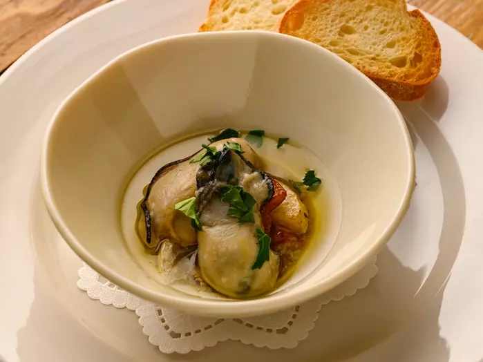 素材の存在感がある『本日のアヒージョ』。この日のメイン具材には、プリッと見事な大ぶりの牡蠣や、ほっくりとした食感のかぶと大根などが入っていました。