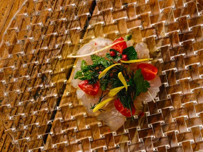 コース2品目に登場する『鮮魚のカルパッチョ』。この日は北海道産のブリのカルパッチョでした。ソースはサッパリと柚子胡椒風味になっており、ディルの香りが心地よく深みを増してくれます