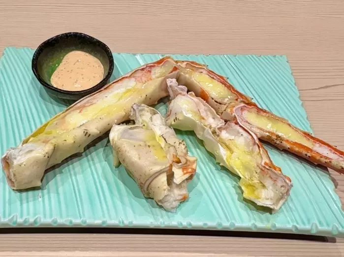 想像を絶するボリュームで登場するタラバガニ。バターで香ばしく炙るスタイルは、海外ゲストにも馴染みやすい濃厚な味わいです。