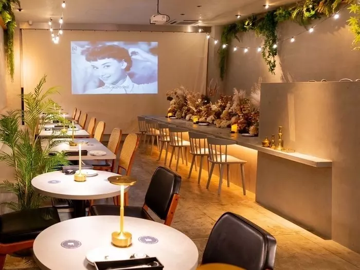 四条通に面したビルの3Fに構えたお店は、街の喧騒を忘れる隠れ家のよう。満月型の照明やドライフラワーが、空間をかわいらしく彩っています。壁面にはプロジェクターによる映像が映され、オシャレな雰囲気です。満月を思わせる真ん丸なテーブル席のほか、ゆったり座れるソファー席もあり、くつろぎのひとときが過ごせます。