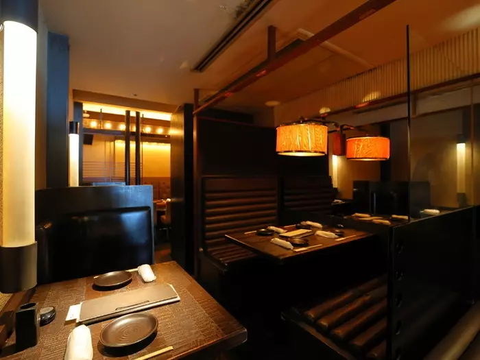 ガラス張りのスタイリッシュな入口から一歩足を踏み入れると、温かみのある照明が心地よい落ち着いた空間が広がります。店内は二つのフロアで構成され、カウンター席、テーブル席、ゆっくり過ごせるソファ席、お座敷席、お座敷個室もあり、シーンに合わせて選べるのもうれしいポイント。“京”をコンセプトにした風情あふれる、とっておきの一軒です。