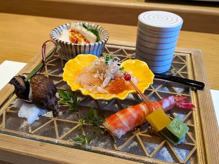最初に登場する、彩り良く華やかな八寸。写真手前の串にささっているのはよもぎとみかん風味の生麩。そっと静かに添えられた「季節感」や「愛媛というご当地感」を出したアレンジに、ふと笑顔になります。なお写真奥の鶏料理には中華ダレがかかっており、味わいの幅も楽しむことができます。