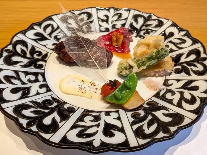 続く主菜は、炭焼きのお肉と玉ねぎのソースがかかったレアめのお肉、2種の食感を楽しめる和牛料理と、鮮魚の天婦羅、野菜。