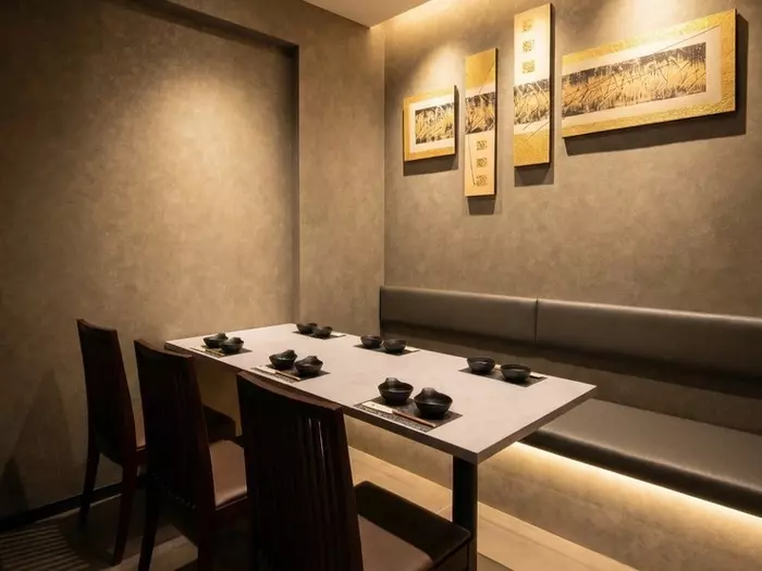 店内にはジャズが流れ、落ち着いた雰囲気。パーティションで仕切られたテーブル席は、程よいプライベート感があり、周りに気兼ねせずに食事が楽しめます。品格を感じる完全個室は、少人数の宴会やビジネスシーンにぴったりです。お一人様やカップルにオススメの、ゆったり座れるカウンター席もあります。