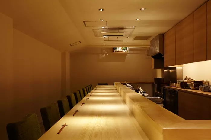 店内はスラっと伸びた白木のカウンター席のみのコンパクトな空間で、落ち着いた雰囲気。暖色の照明と温かみのある接客が相まって、穏やかな時間を過ごせそうです。路地裏にひっそりと佇む隠れ家的な立地も特徴で、料理と向き合いながらゆったりと会話を楽しめます。上質でありながら肩肘張らずに過ごせる一軒です。