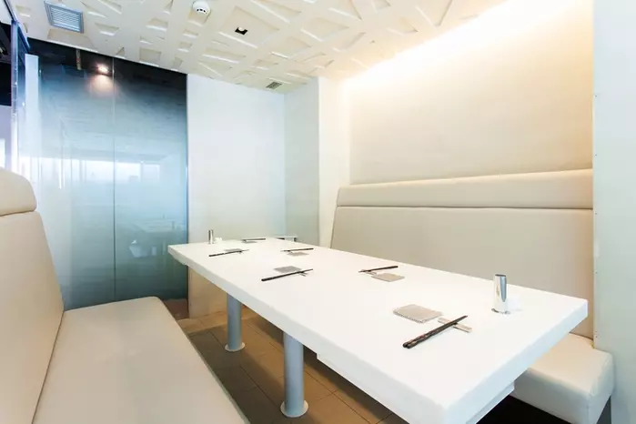 白を基調とした明るい雰囲気の個室。半透明のガラスがプライベート感と開放感の両方を成り立たせています