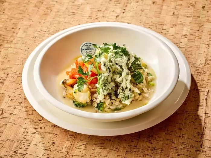 ポルトガルを代表する食材の一つ、「タラ」を使用したリゾットです。タラのオリーブオイル漬けを使用してリゾットを炊き上げ、またフレッシュな食感を出すために、生のタラを揚げてリゾットに混ぜ込むという工夫がなされているそう。季節野菜と雑穀米によるやさしい味わいで、てんぷらのルーツとも言われているポルトガルのフリットとアクセントにマッサ・ド・ピメント(パプリカをを使用した伝統的調味料)、フレッシュなトマトが添えられています。