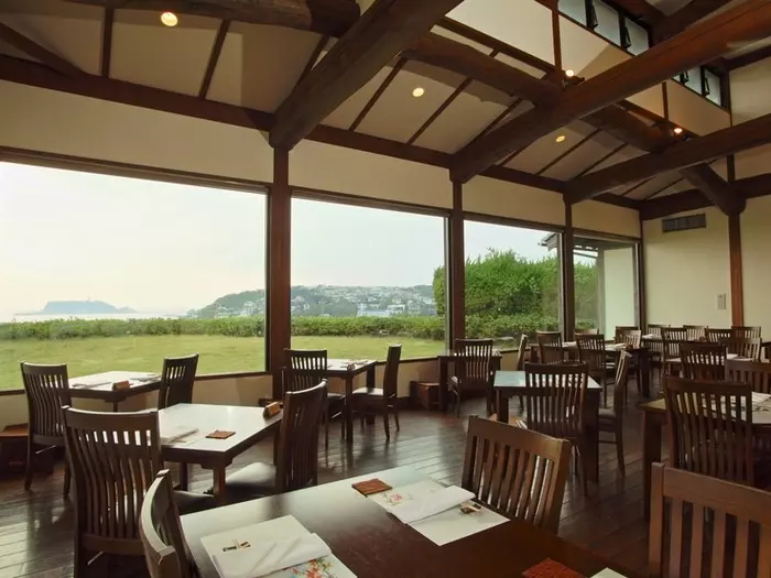 すべてのテーブル席から江の島を望める