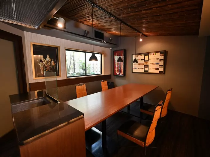 ビル内の長い通路の先に、ひっそりとお店が佇んでいます。街の喧騒が届かない落ち着いた空間は、まるで隠れ家のよう。黒を基調とした店内はカウンター席のみの構成で、横並びに座れば自然に会話も弾みそうです。目の前で繰り広げられるシェフの手捌きを眺めながら、非日常のひとときが過ごせます。