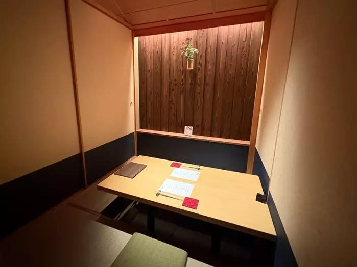 打ち水が施された玄関をくぐると、そこには外の喧騒が嘘のような静寂が広がっています。全席個室の店内は、木の質感が温かい重厚な純和風の設え。2名専用の隠れ家のような個室から、12名まで対応可能な格調高い広間まで完備されており、まさに「大切な人を招くための特別な空間」です。