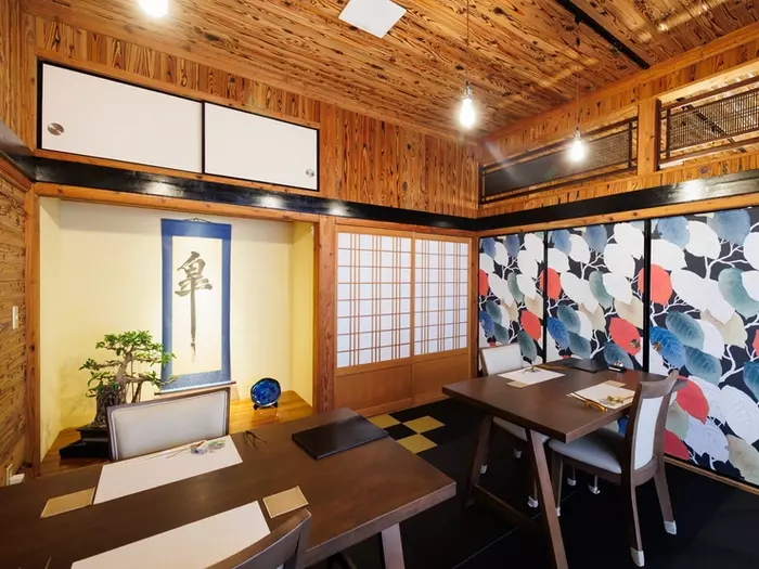 島の中心街・ユーグレナモールにほど近い便利な立地にあるお店は、古民家ならではの温かい雰囲気。ノスタルジックな風情を残しつつ、モダンな柄の襖などのオシャレな設えが優美な空間をつくっています。店内には、2名から約16名まで収容できる広さの異なる個室を用意。