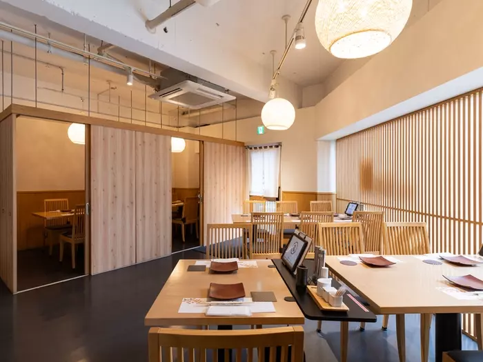 店内は、和の温もりに包まれた空間。厨房を囲むように配されたコの字型のカウンター席には、肘掛け付きの椅子が置かれ、お一人様でもゆっくり過ごせます。家族やグループでの旅にぴったりな、広々としたテーブル席や個室も完備。地酒のラインナップも豊富で、きめ細やかな接客とともに、心も体も満たされる時間を演出してくれます。