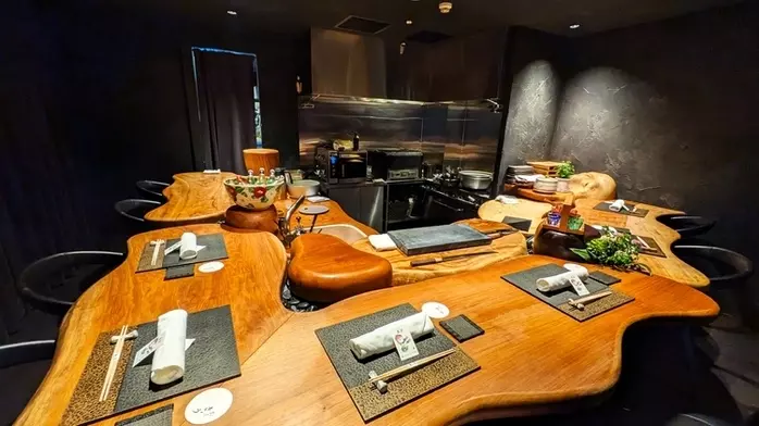 それは、日本料理店や割烹の言葉から連想するような直線式のカウンターではなく、料理人を取り囲むように席が配置された、木の温かみが全面に出された曲線がおもしろいカウンター席。随所に植物や食器、そして今日使うであろう調理器具もいくつか配置され、黒い内壁がそれらを浮かび上がらせている様子はまるでお店全体がひとつの舞台のよう。