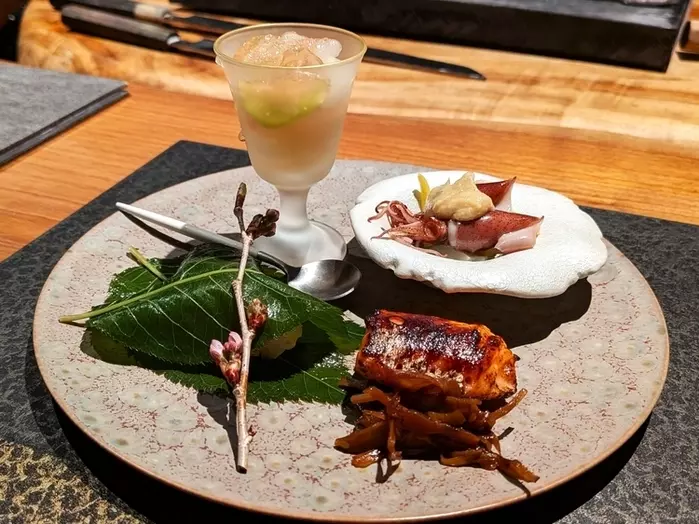 思わず美しさに声が漏れてしまった、この日の季節の『八寸』。桜鱒やホタルイカ、桜の花びらを混ぜたジュレを使用した一品や、桜葉で包んだ桜鯛の鮨……と、春の香りをのせたお皿に、思わず“お花見”をした時のような感動を覚えました
