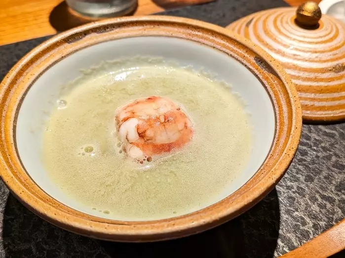 ある日の一品目に登場した『そら豆の擦り流し』。中央には車海老の真薯。ふわっと優しく身体があたたまり、春分を告げるそら豆の自然の香りに包まれていきます