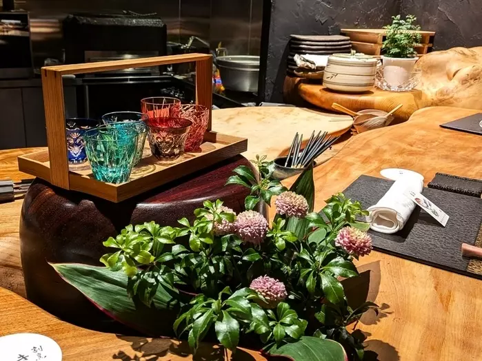 「ここから好きなものを選んでください」と、のちに日本酒を選んだ際に渡してもらえた多彩なグラスたち。最初はカウンターに佇んでいたところからスッと目の前に登場する様は、グラスも一人の“役者”のよう