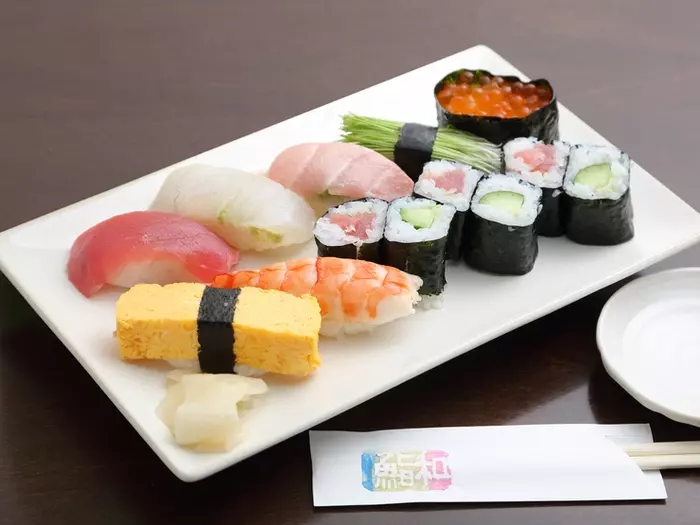 福生駅から徒歩3分の【鮨和】では、料理人が毎朝「八王子綜合卸市場」へ向かい、目利きして仕入れる季節の鮮魚で握る寿司が味わえます。中トロや白身魚などの握り7貫に巻物がつく『上にぎり』は、手頃な価格で満足度の高い味わいです。