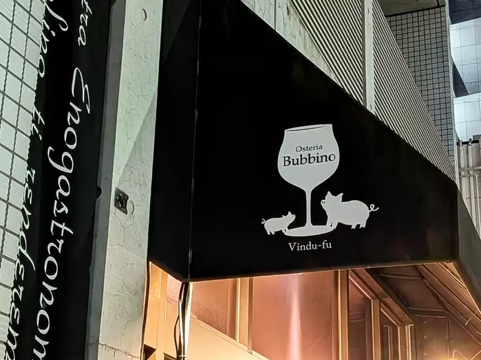 人形町駅から歩いてほどなく、通りへ入ったところに現れる【オステリア ブッビーノ】。落ち着いた雰囲気の外観で、入り口の「ワイングラスに豚ちゃんたちが集う」イラストには早くも心を掴まれてしまいました。