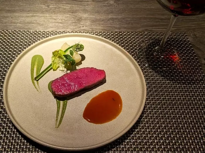 断面の美しい、この日の肉料理の仔牛。色のコントラストも鮮やかな、芽キャベツのソースが添えられています