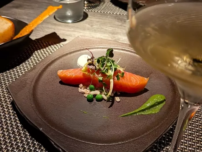 軽く燻製させたサーモン。イタリア産のグリーンピースが添えられています