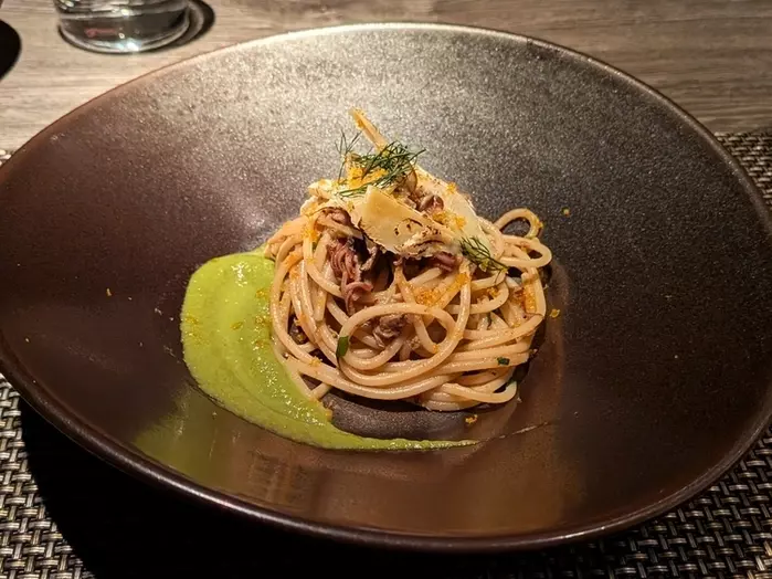 イタリア産のからすみと、季節を感じるホタルイカを使用したパスタ。ういきょうのソースがアクセントになっています