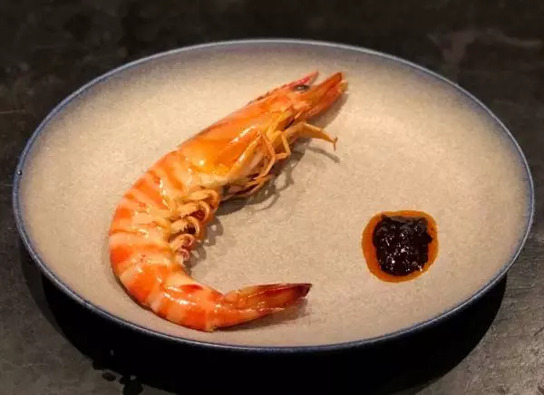 目の前で活車エビを玖瑰露酒(メイクルチュウ)に漬ける『酔っ払い海老』(活車えび)1piece 800円(税抜)