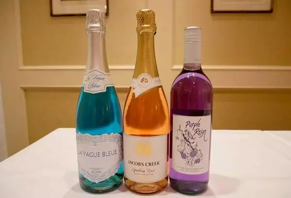 ブルー、ロゼ、パープルなど、カラフルなスパークリングやワインが並びます。搾りたてのグレープフルーツのようにフレッシュな味わいが魅力の『LAVAGUE BLEUE』(左)ほか