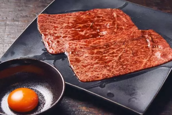 内モモの中でも大きく分厚い「オオモモ」という部位をつかった、すきやき風の焼肉。さっと炙り、濃厚卵と特製ダレにつけて食べれば幸せ気分に。