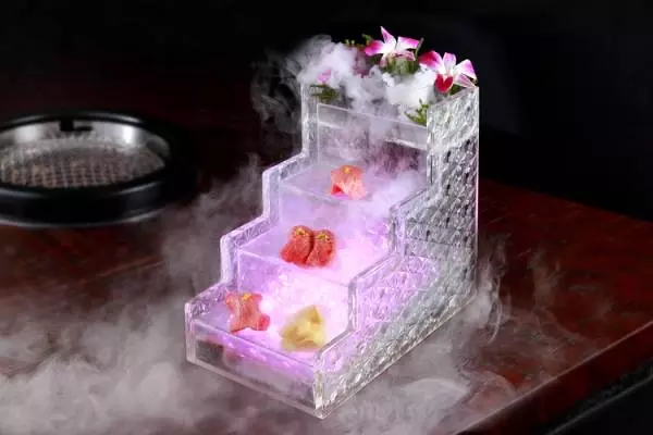 『硝子のシンデレラ寿司』2,800円。光る階段に乗った『硝子のシンデレラ寿司』。ドライアイスの煙に包まれて登場する、驚きのあるメニューです!