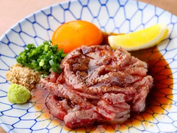 お肉を焼く前にまずは前菜を食べて胃をほぐしたいですが、絶対にオーダーして欲しいのが炙り『ユッケ』です。焼肉店の人気メニューといえばユッケですが、過去に発生した食中毒等の影響で、今では保健所の許可を得た店舗でしか提供できなくなっています。