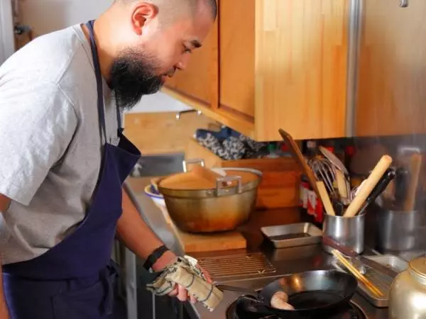 開店以来伸ばしているアゴヒゲがトレードマークの店主・上松晃大さん