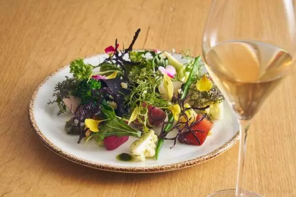 鎌倉と聞けば、農協連即売所・通称レンバイに並ぶような彩り豊かな「鎌倉野菜」を思い浮かべる人も少なくないのでは? そのイメージをそのまま表した一皿がこちらのサラダです。ふんだんに盛り込まれた鎌倉野菜は、それぞれの持ち味を引き出すように異なる調理を施され、セロリや大葉、塩漬けレモンなどを使った数種類のソースを添えて。