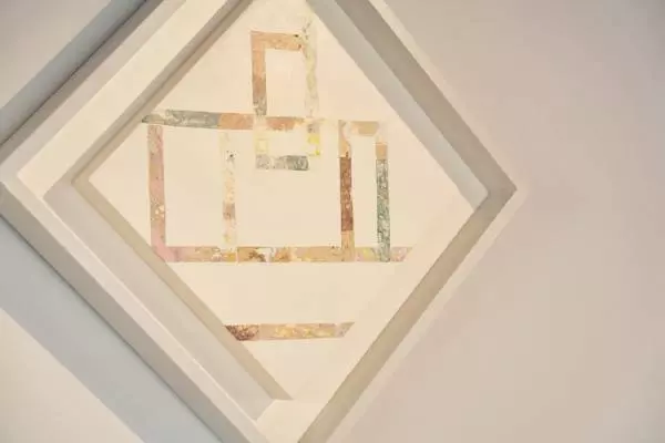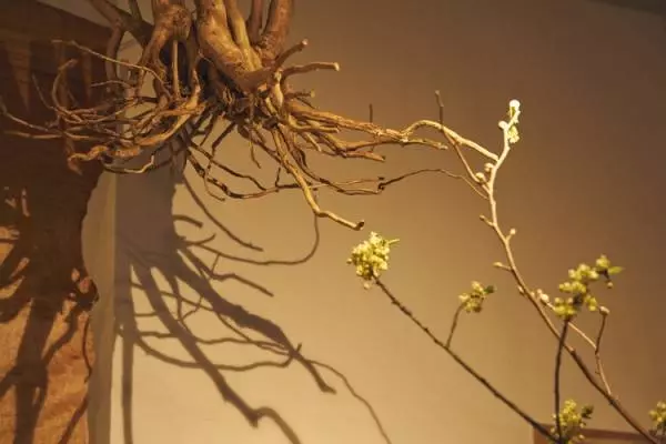 エントランスの植え込みから店内のコーナーまでに配されたグリーン、オブジェのように吊られて柔らかい影をつくる木の根。壁はあえて天井とトーンの違うライトグレーを使い、そこにはアートが飾られています。
