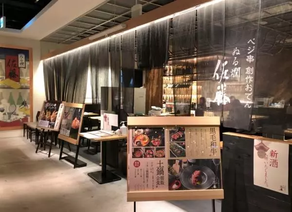 「ぬる燗 佐藤」の女性向け店舗【ベジ串 創作おでん ぬる燗佐藤】。ヒカリエ7階の「TABLE7」フロアの突きあたりにあり、ほんのり透ける暖簾から落ち着いた雰囲気が漂います。