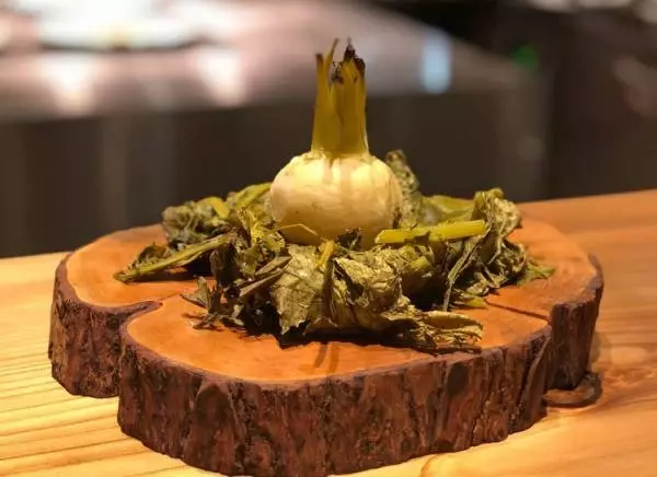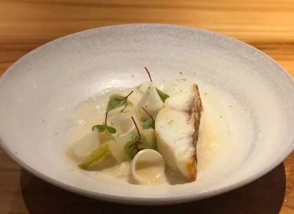 ふっくらとした食感の真鯛のロースト。付け合わせのカブは葉でくるみ高温で蒸すので、瑞々しい仕上がりに