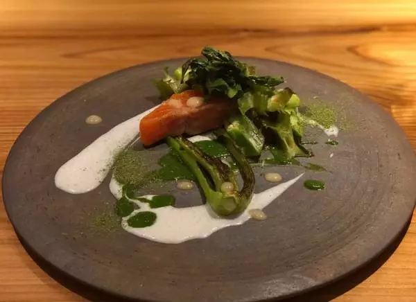 岩手県・八幡平清水川養鱒場の八幡平のサーモンに、千葉県・柴海農園の小松菜、オクラ、シカクマメ、さらにケールを添え、上にはヨーグルトソースをかけた一品