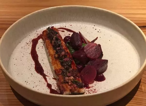 静岡県産のうなぎに千葉県産のビーツやわさび菜、赤玉ねぎを添えた一品。