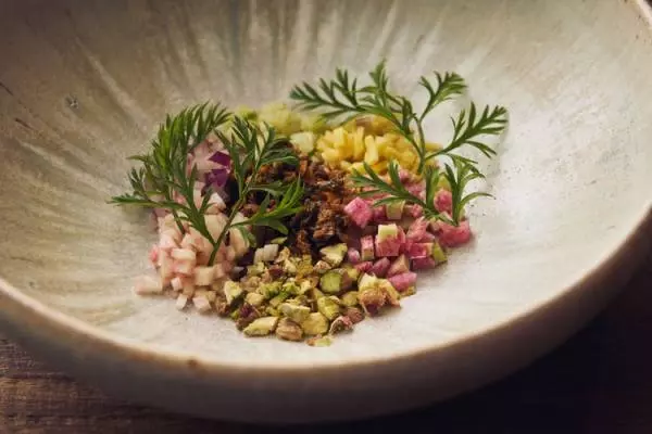 『グンドゥルックのアチャール』。周りは紅真大根、ビーツ、ピスタチオなど。よく混ぜていただく。グンドゥルックの酸味が野菜の味を引き立てる