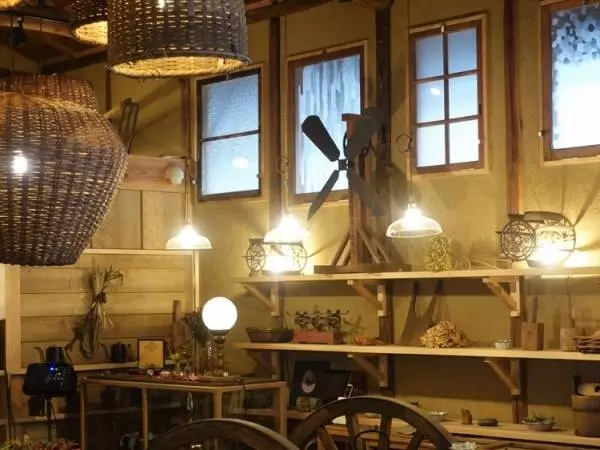 店内には納屋の面影が残され、使用されていた農具が展示されているのが印象的