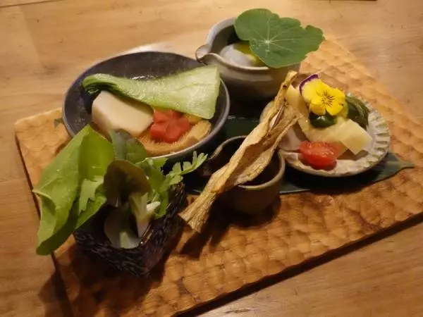 そんな石坂オーガニックファームの一角に、農業と土を感じながら季節ごとの食事を楽しむ場所として誕生したのが【納屋茶寮 MEGURU】です。かつて納屋だった建物をリノベーションし、梁はそのまま、農具なども残されています。農家の息遣いが感じられる空間で、豊かな土壌で育まれた固有種の野菜や、発酵を通して微生物の力をいただく食体験は、より土や作物への理解を深めてくれるでしょう。