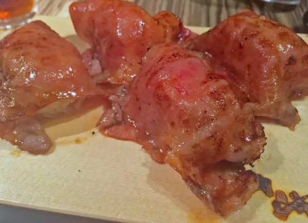 薄切りの大きな一枚のサーロインをさっと両面炙り、卵黄を溶いたものにつけ、ひと口大のご飯をくるんでいただきます。最高に甘い脂の乗ったサーロインは口の中でさっと溶けるおいしさです。