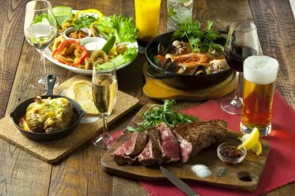 ビアテラスコースでは、アンガス牛ロース肉の1パウンドステーキや、骨付豚すね肉のローストからメインを選べます。プランは「Festa di Terrazzo 飲み放題付ビアテラスコース」5,500円、「Festa di Terrazzo パスタ付ビアテラスコース」6,000円の2種。