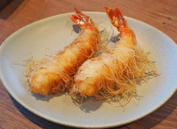 『ASCブラックタイガーのカダイフ』。海老のプリっとした弾力とサクサク衣の食感のコントラストが楽しめます