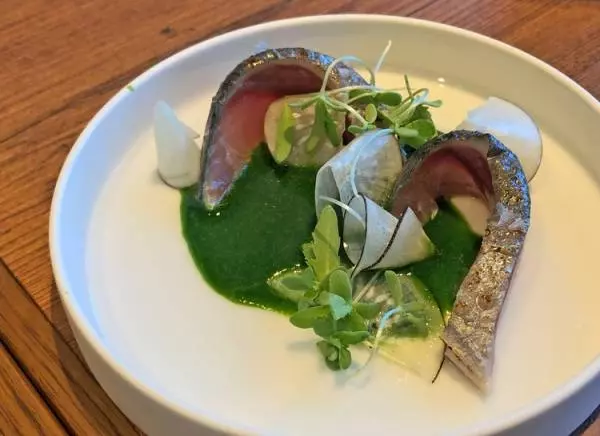 水揚げしても食用として流通しない「未利用魚(ミリヨーギョ)」のオアカムロを使った『オアカムロと春菊のソース』。オアカムロはアジ科の魚で脂がのっており、いまが旬。