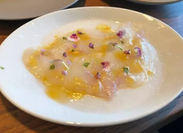 こちらもミリヨーギョの『ウッカリカサゴのカルパッチョ』。淡泊な味わいで、弾力があり歯ごたえもしっかり