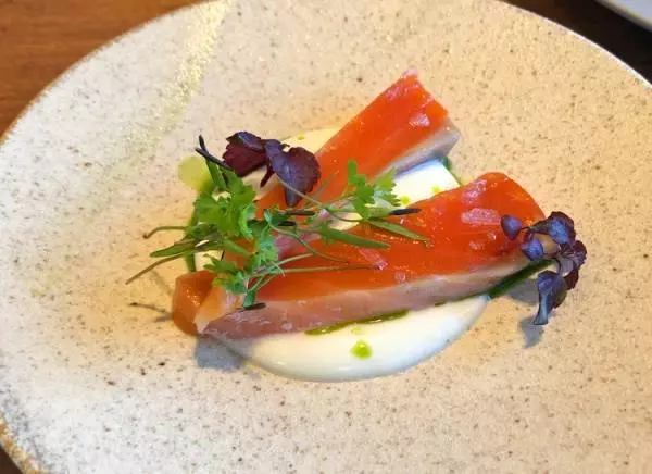 『ASC燻製銀鮭とカリフラワームース』。銀鮭の塩気をカリフラワーソースが優しく包み込みます