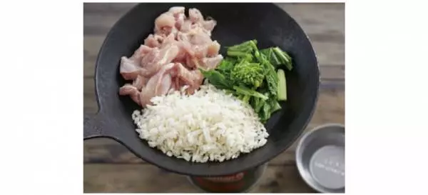 1.鶏モモ肉はひと口大に、菜の花は2~3cmに切る。2.米と1をフライパンに入れ、オリーブオイルと水を加えて強火にかける。