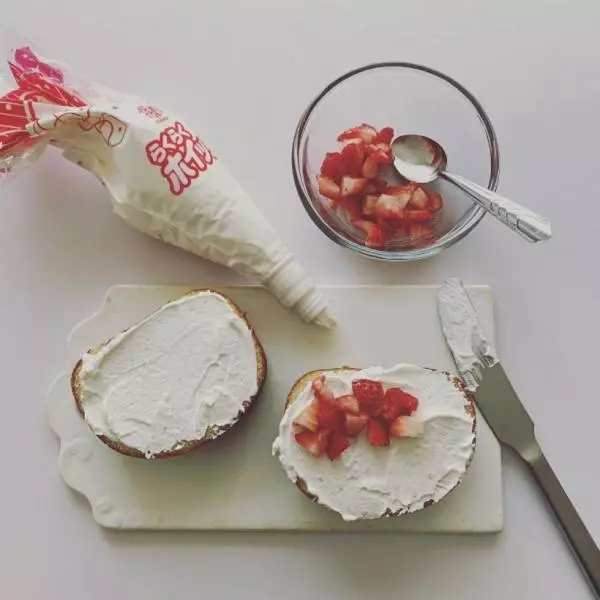 ロールケーキ2個の片面にホイップクリームを塗って、①で小さく刻んだイチゴを敷き詰めてサンドする。